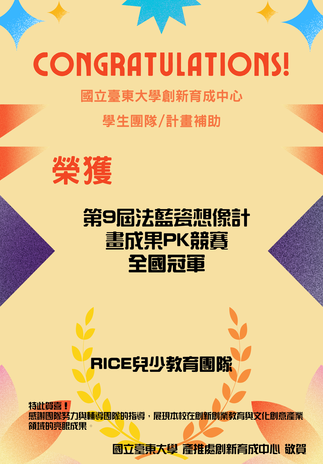 國立臺東大學創新育成中心進駐團隊 「RICE兒少教育團隊」,參與 第9屆法藍瓷想像計畫成果PK競賽,與 臺東大王國中 攜手合作,以兼具教育創意與地方實踐精神的提案脫穎而出,榮獲 全國冠軍 佳績!
