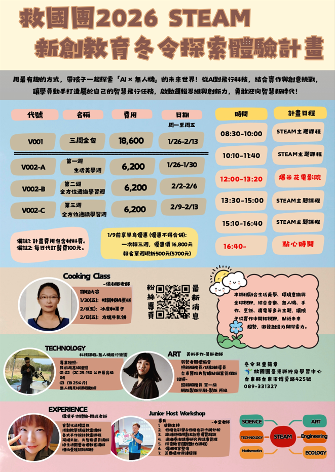 【推廣教育中心】轉知 中國青年救國團直屬臺灣省臺東縣團務指導委員會「2026STEAM新創教育冬令探索體驗計畫」 報名中!!!