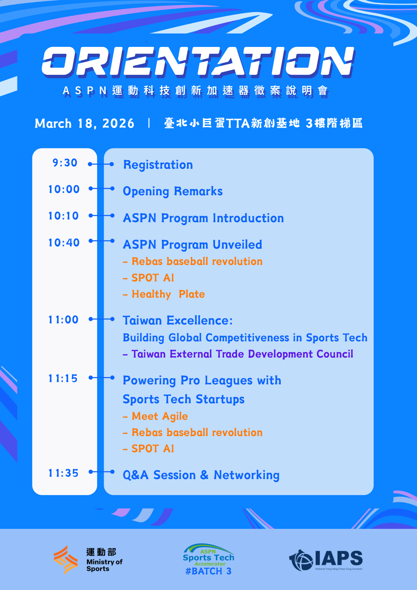 一、運動部與國立陽明交通大學合作辦理「2025-2026 ASPN 國際運動創新網絡專案計畫」第3期徵案,歡迎運動創新相關團隊踴躍申請。