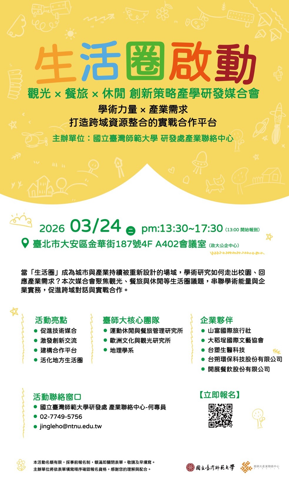 一、國立臺灣師範大學訂於115年3月24日(星期二)辦理「生活圈啟動!觀光、餐旅、休閒創新策略產學研發媒合會」實體活動,敬邀有興趣之教師踴躍參與。